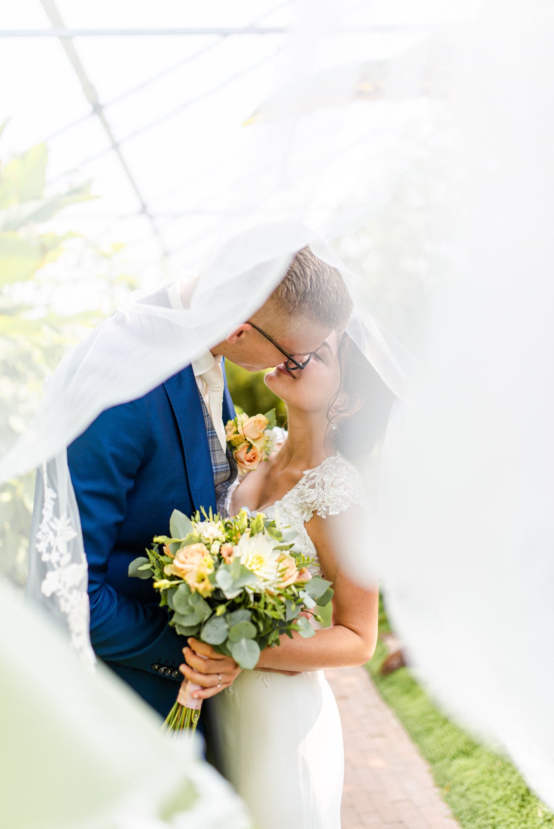 Trouwen in augustus, heerlijk weer & een buitenbruiloft... Veel bruidsparen dromen hiervan, toch maak ik geregeld regen mee op bruiloften in zomermaanden. Aan het begin van deze bruiloft was het aan het regenen en leek het er ook niet op dat het mooi weer zou blijven. En tóch was het zo! Precies op de goede momenten was het droog, er kon zelfs buiten getrouwd worden! Wát een cadeautje! Een overdekte fotoshootlocatie als back-up plan bleek ineens fantastisch, alles viel op z'n plek.