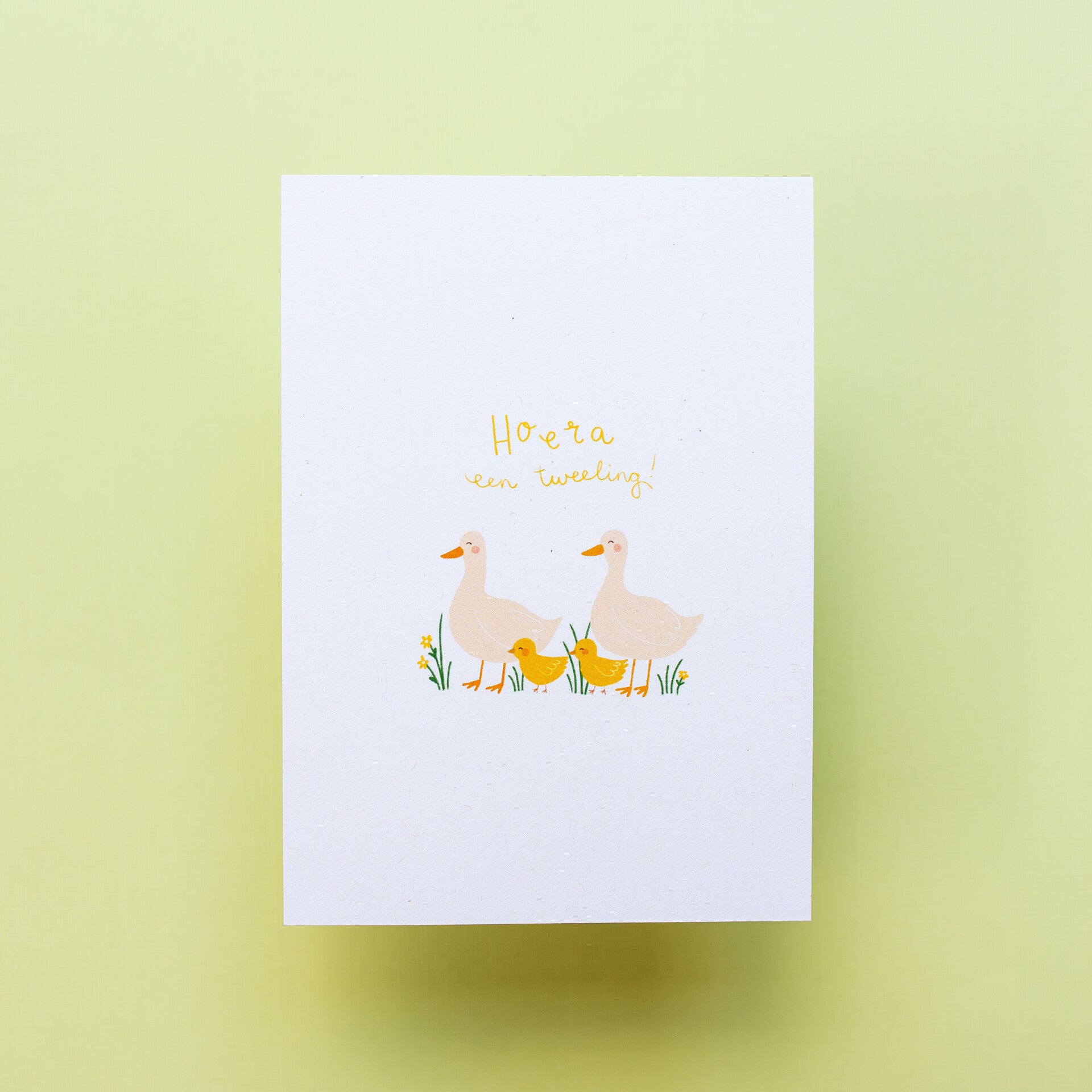 Een duurzaam kaartje met een vrolijke illustratie een eenden-gezinnetje. De illustratie is met de hand getekend en gedrukt op 100% gerecycled papier. Op de achterkant van de kaart is er ruimte om een tekst te schrijven. Wie stuur jij deze duurzame kaart?